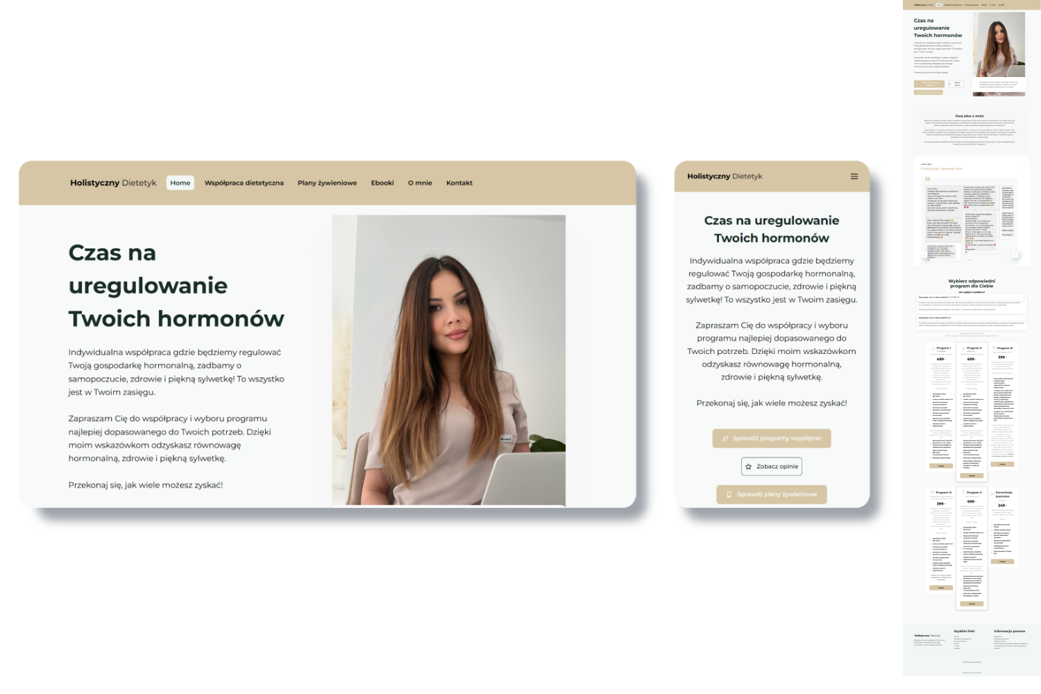Efektem prac jest nowoczesna, estetyczna i funkcjonalna strona internetowa, która podkreśla profesjonalizm Holistycznego Dietetyka oraz wspiera go w budowaniu relacji z klientami. Strona umożliwia sprzedaż produktów cyfrowych, łatwy kontakt, sprawne zapisy na konsultacje oraz edukację odbiorców. To kompletna, skalowalna platforma, która rozwija ofertę klienta w przestrzeni online.