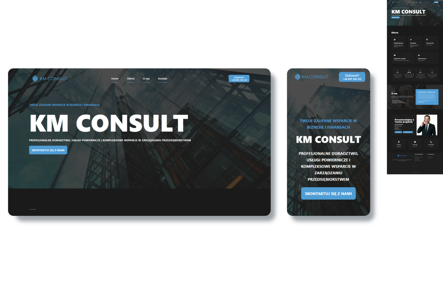W efekcie powstała nowoczesna, funkcjonalna i estetyczna strona internetowa dla KM CONSULT, która skutecznie realizuje kluczowe cele: prezentuje ofertę doradczą, buduje wizerunek eksperta, ułatwia kontakt i pozyskanie klientów biznesowych. Dzięki temu klient może skupić się na świadczeniu usług i wzroście firmy, a użytkownicy — na szybkim zapoznaniu się z ofertą i podjęciu decyzji o współpracy.